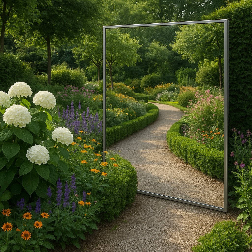 Spiegel im Garten lassen sich mit unterschiedlichen Stilrichtungen verbinden. Rustikale Zinnspiegel mit antikem Patina-Finish schaffen ein nostalgisches Flair, das hervorragend zu Steinmauern und wilden Blumenrabatten passt. Moderne, rahmenlose Spiegel aus bruchfestem Acrylglas wirken minimalistisch und streng, ideal für zeitgenössische Gärten mit klaren Linien und geometrischen Beeten. Mit einer Mischung aus beiden Stilen entsteht ein spannender Kontrast, der den Garten lebendiger erscheinen lässt.