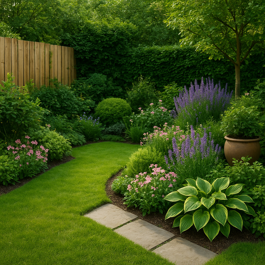 - Helle Töne für den Hintergrund: Ein hell gestrichener Zaun oder helle Pflastersteine reflektieren Licht und lassen den Garten weit erscheinen.